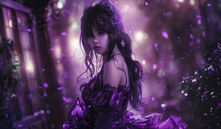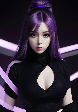 beautiful asian girl with purple hair and futuristic makeup on dark background