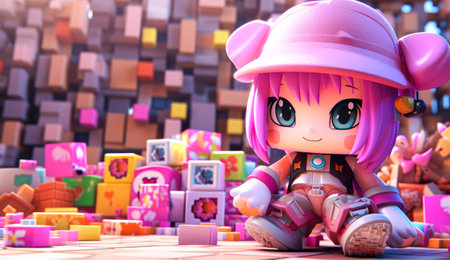 Kawaii girl surrounded by many colorful cubes, 3d illustration
