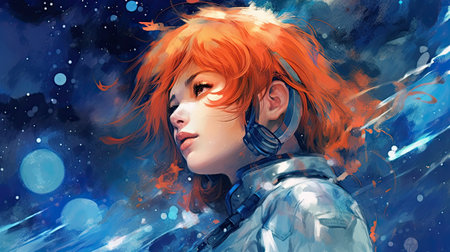 Portrait of a beautiful red-haired girl in space suit.