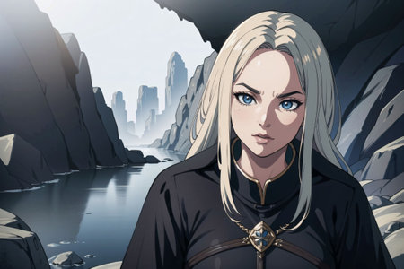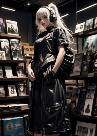 A captivating portrait showcasing a young woman with silver hair in a dark costume. The intriguing expression and stylish outfit evoke a sense of mystery and artistry.