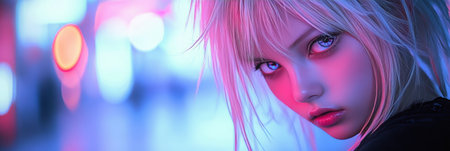 Glamorous Cyberpunk Portrait of a Young Woman in a Neon Cityscape with Futuristic Fashion and Makeup