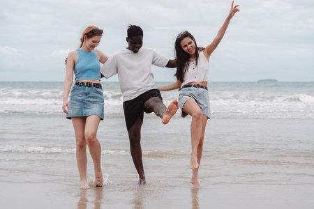 Diverse group of happy friends playing and splashing water on the beach summer vacation. Concept of fun, joy, freedom, and multicultural friendship.