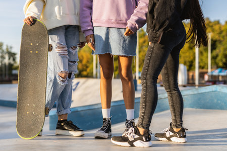Multicultural group of young friends bonding outdoors and having fun - Stylish cool teens gathering at urban skate park