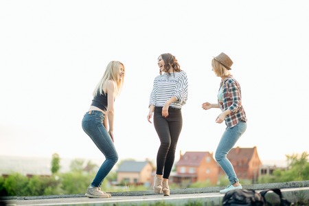 Group of girlfriends having fun outdoors. Stylish teenage girlfriends friends on vacation. Pretty girlfriends. Girls on travel. Fashionable teens. Three girlfriends in hippie style. Gen Z friends.