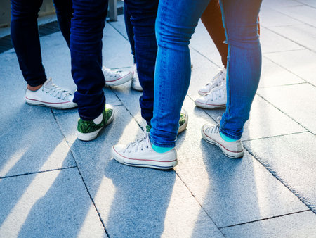 Close up of legs and feet of three friends standing on a street and talking