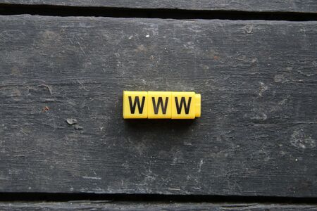 WWW - conceptual text on wooden cubes on a bright background and a black pot with a flower behind