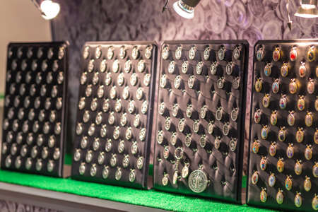 BOLOGNA, ITALY - FEBRUARY 18, 2019: lights are enlightening medals at stand of BOMAP in DEVOTIO Religious products and service exhibition