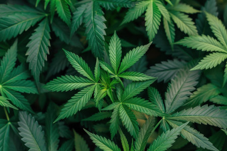 Top view of vibrant green cannabis sativa plant leaves, ideal for natural medicine themes
