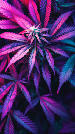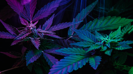 Sativa marijuana plant in glowing neon light. Indica rasterized herbal cannabis.