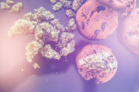 Concept of cooking with cannabis herb CBD. Cookies with cannabis and buds of marijuana on the table. Treatment of medical marijuana for use in food, black background. light leaks