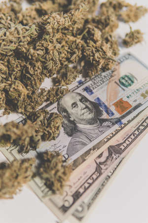 Cannabis in Economics . Money weed. marijuana bud and banknotes of dollars. The pot buds. Cannabis money black market. White background. CBD THC herb. Sativa medical health. Vertical shot .