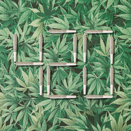 420 Photo illustration with cannabis joints on marijuana leaf background