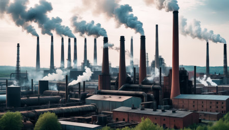 Polluted industrial landscape with towering smokestacks and rusting machinery under ominous skies