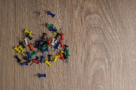 thumbtacks of colors on old wood top view