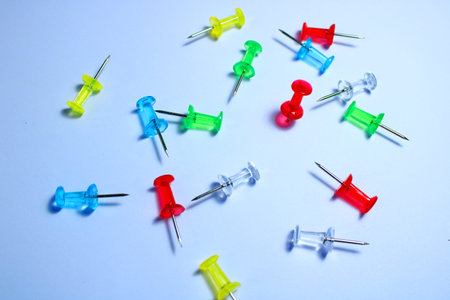 A handful of pushpins in a random position on a white background.