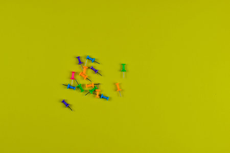 Colorful push pins on yellow-green surface highlight organization, planning, and visual contrast in office or educational settings.