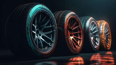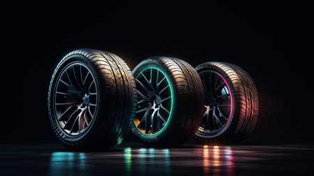This image presents a set of car wheels and tires arranged on a dark surface. The composition emphasizes the textures and patterns, with a focus on the metallic rims and the rubber tires. The lighting suggests a studio environment, suitable for automotive, design, or product promotion.