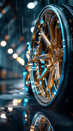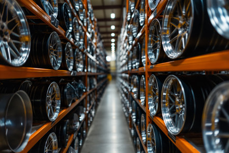 High-quality chrome wheel display showcasing precision engineering in a modern automotive factory setting. Generative AI