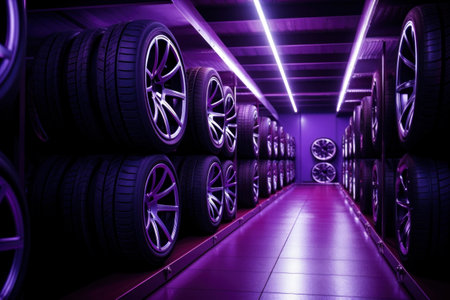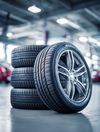 Bright workshop scene featuring four sleek alloy-rimmed tires neatly stacked under contemporary industrial lighting, embodying precision and speed readiness.