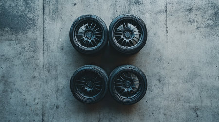 This image features four black car tires arranged in a symmetrical pattern on a concrete surface. Ideal for automotive, transportation, or industrial themes.
