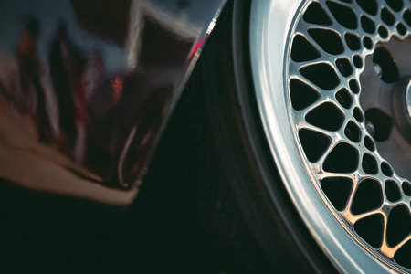 a shiny disc, cast in one piece from a light alloy of metals, a wheel of a car of old times. Close up of vehicle details. Concept of style and racing. Selective focus