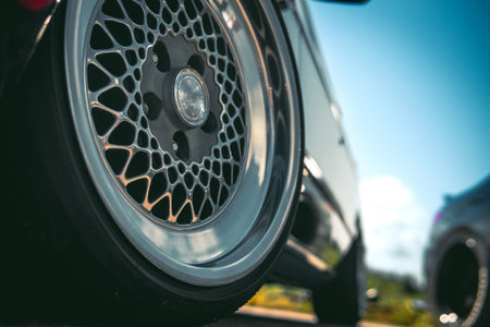 a shiny disc, cast in one piece from a light alloy of metals, a wheel of a car of old times. Close up of vehicle details. Concept of style and racing. Selective focus. Copy space