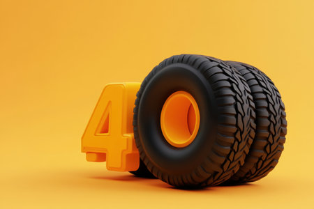 A tire with the number forty on it. The tire is black and orange. The tire is on a yellow background