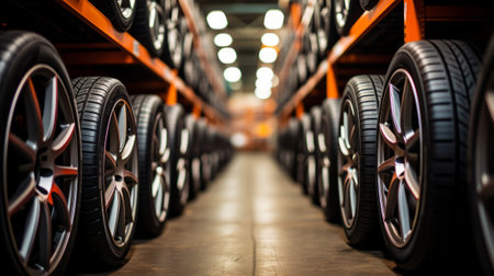 Alloy wheels automobile on service center racks. Auto replacement wheels in transport garage. Generate ai