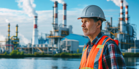 Confident Industrial Expert in Front of Power Plant with Dynamic Background