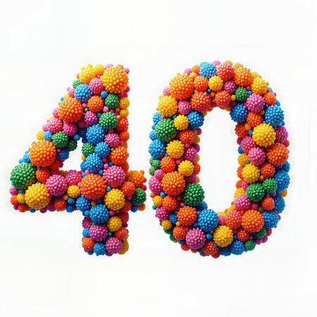 Greeting card for 40 years. Vibrant and festive number 40 crafted from multicolored small balls, perfect for a birthday celebration.