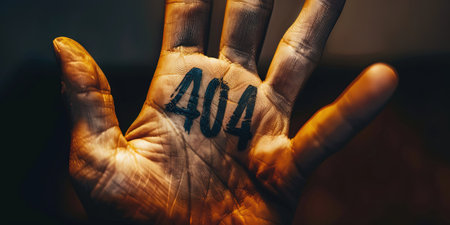 Hand with the word 404 on the palm of the hand. Conceptual image