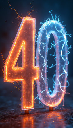 The striking number 40 stands tall, with one digit glowing in fiery orange and the other in cool blue, surrounded by dynamic electric sparks. This electrifying visual captures the essence of celebration and milestones, making it perfect for commemorating special occasions.