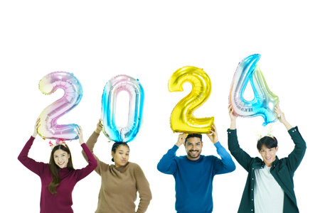 Group of diverse ethnicity young people celebrating Christmas and new year party together, men and women showing a fantasy balloon over their head in number of a year 2024 and firing a paper firework.