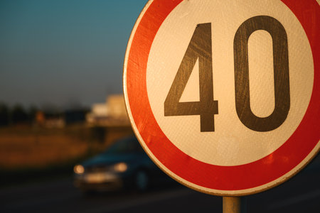 Car speeding by the 40 speed limit traffic sign, motion blur image with selective focus