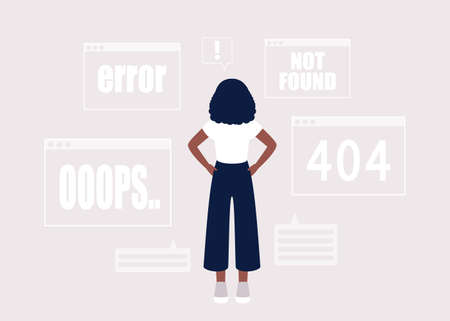 Website 404 error concept. Woman with web pages with problems. Lost, not found pages. Colorful flat vector illustration
