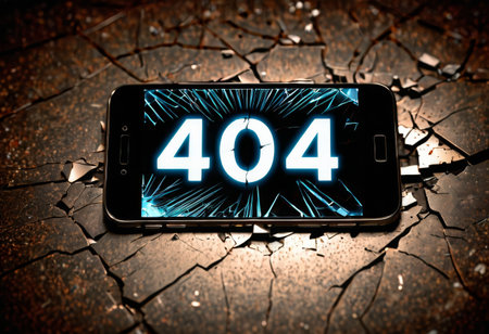 A smartphone is showcased against a cracked earth texture, its screen vividly portraying an error 404 message. The image symbolizes technological distress juxtaposed with environmental textures. AI generation