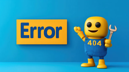 A cheerful yellow character with a wrench stands next to a large error message in bold lettering.