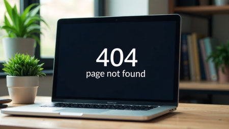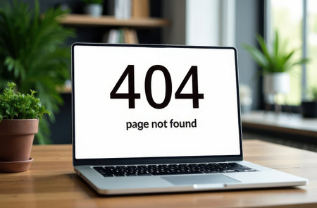 A laptop on a wooden desk shows a 404 page not found error. The background features a window with natural light and a small green plant nearby, creating a calm workspace..