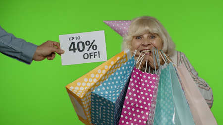 Inscription Up To 40 Percent Off appears next to smiling grandmother. Senior woman with shopping bags celebrating, dancing, looking satisfied with low prices, discounts, shopping on Black Friday