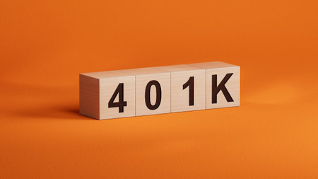 wooden cubes with 401K business word. Mission, Vision and core values concept.close up of wooden cubes,Business Concept.3D rendering on orange background.