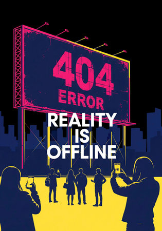 A striking graphic depicts a billboard with a 404 error message, contrasting the digital world with the phrase 'Reality is offline'.