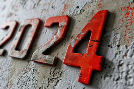 Red 3D inscription on a white background 2024. Metal on concrete. AI generative.