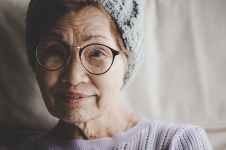 Asian elder woman 60s with black hair and wrinkled on face show her eyes and eyebrow tattoo before cornea surgery, beauty and healthcare concept