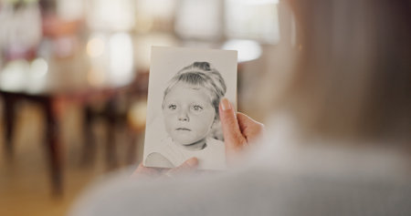 Hands, photograph and elderly person in retirement with memory, relax with history for nostalgia and think about life. Remember, past and old age with pension, retro picture and rest in lounge