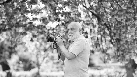 Everyone photogenic. Senior man taking selfie photo vintage camera. Self portrait. Memories in snap. Retro equipment for taking photo. Sharing his knowledge making good photo. Imitate fashion trends