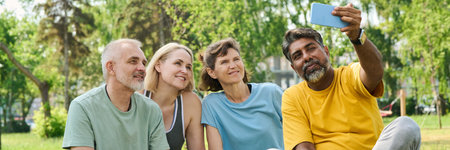 Banner of happy mature people in activewear looking at screen of mobile phone held by multiethnic man while watching online video outdoors