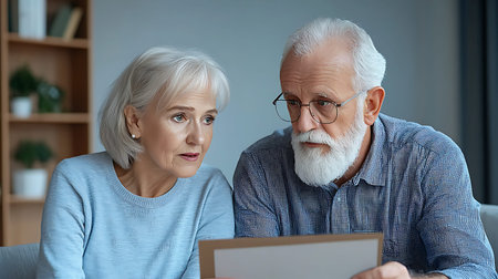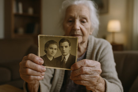 Elderly woman holding a vintage photograph of a couple in a cozy room. concept of memory, nostalgia, family history.