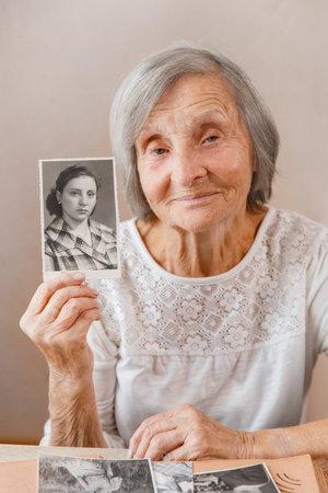 Old woman remembers her youth. Grandma keeps her photo in her youth. Memories. Vintage old photos