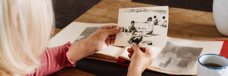 rear view of an elderly woman looking at old photos while sitting in a cafe