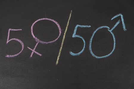 the expression 50-50, where the zero is depicted with a female gender symbol and a male gender symbol, cut out in a black paper, as a depiction of the gender equality concept